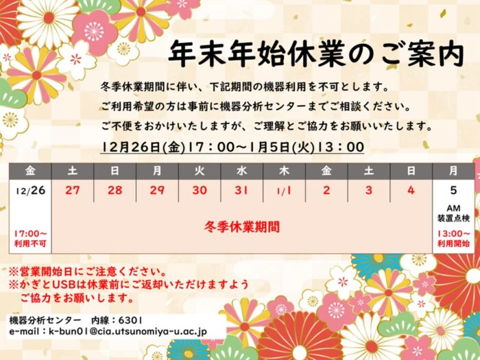 機器分析センターの2024年度冬季休業期間は下記のとおりです。