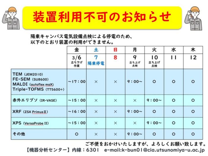 陽東キャンパス電気工事による停電のため、下記の期間一部装置の利用ができません。